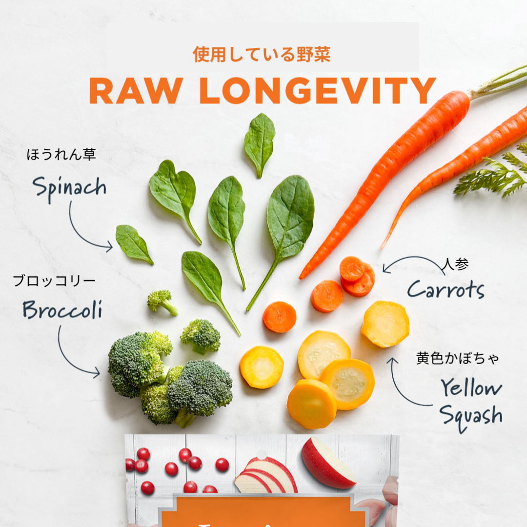 新鮮なビーフ(内臓、骨を含む)を93%、野菜、果物などの素材を7%使用して作りました。厳選された野菜と果物によって、ペットの健康維持と健康寿命に必要な栄養素を摂ることができます。