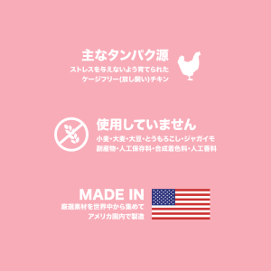 グレインフリー(穀物・トウモロコシ・小麦)、大豆、ジャガイモ、人工着色料、合成保存料は不使用